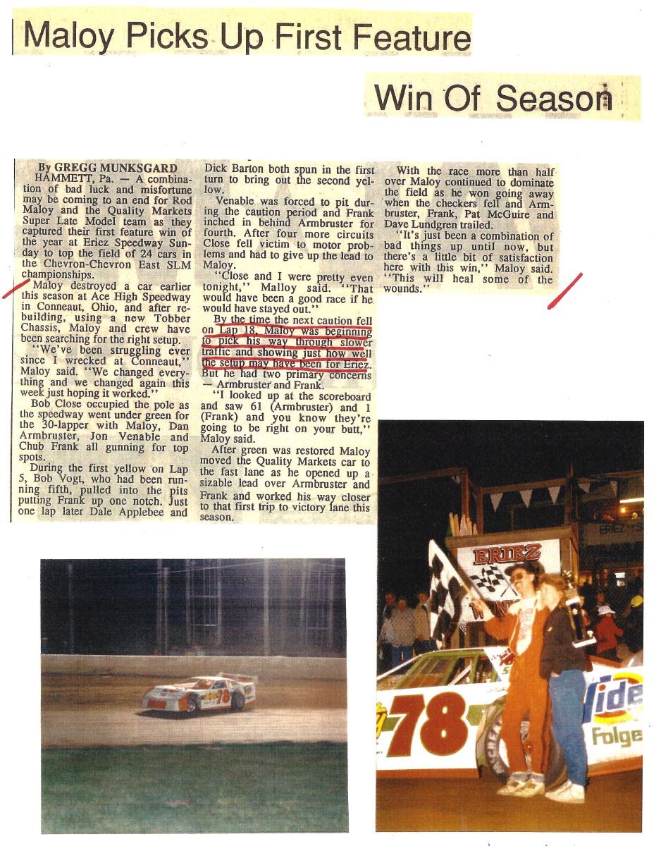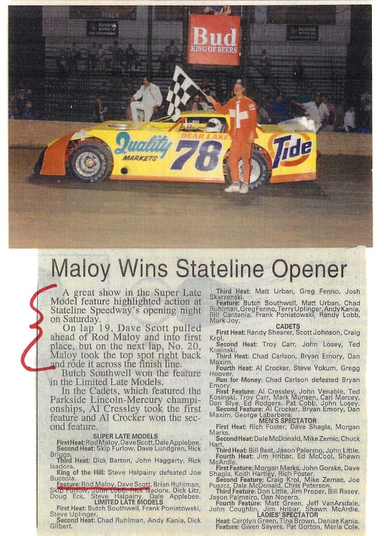 Fourteen years after first climbing behind the wheel of a race car. Rod was able to achieve his goal of racing in the top class in 1990. With valuable sponsorship dollars from Quality Markets, Maloy rolled out a #78 super late model. The highlight of his rookie season racing with the “big dogs” was a surprise win in a 40-lap race at Stateline on September 1, using an engine he had cobbled together from used parts the night before.