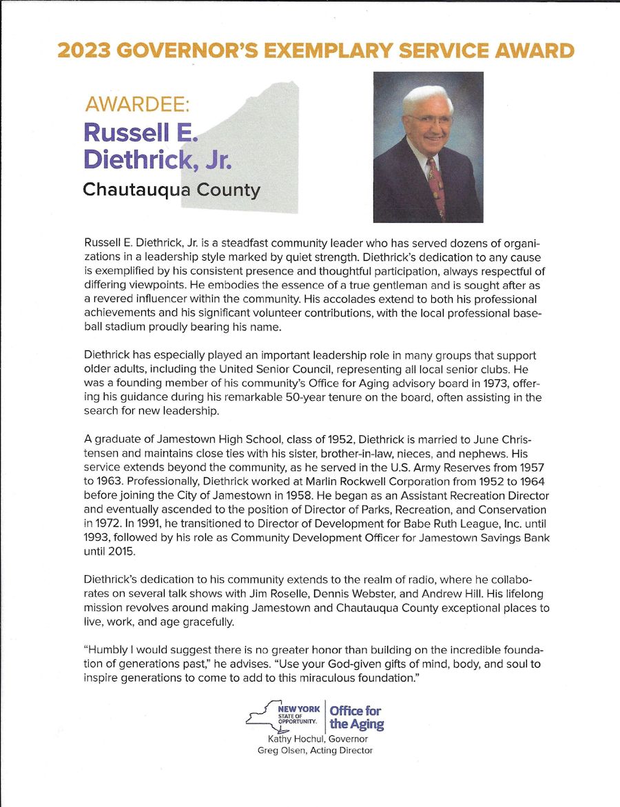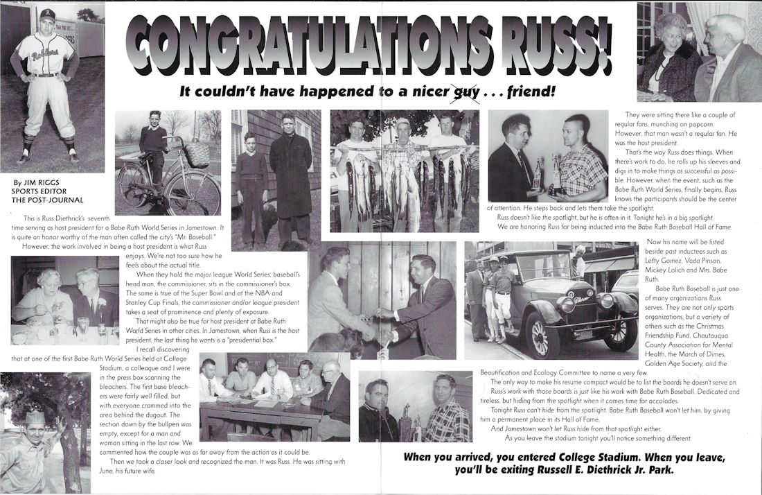 Diethrick is a past district commissioner of the Amateur Softball Association of America, was tournament chairman for the Middle Atlantic Regional Babe Ruth Tournament and the first two 13-year Old Babe Ruth World Series which were held at College Stadium.