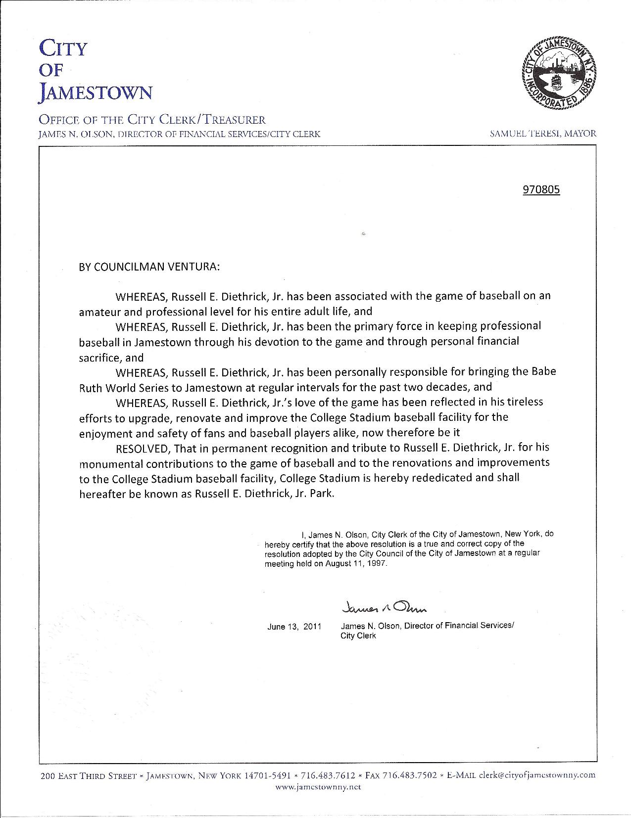 He became full-time Recreation Director after Sharp's retirement. The title was later changed to Jamestown Parks, Recreation and Conservation Director and entailed supervising about 20 youth baseball leagues, all recreational sports for boys and girls in the city and several adult programs. In the 1970's he was assistant general manager, with Eric Gougin, of the Jamestown Expos of the New York-Pennsylvania League and is a past director of the league.