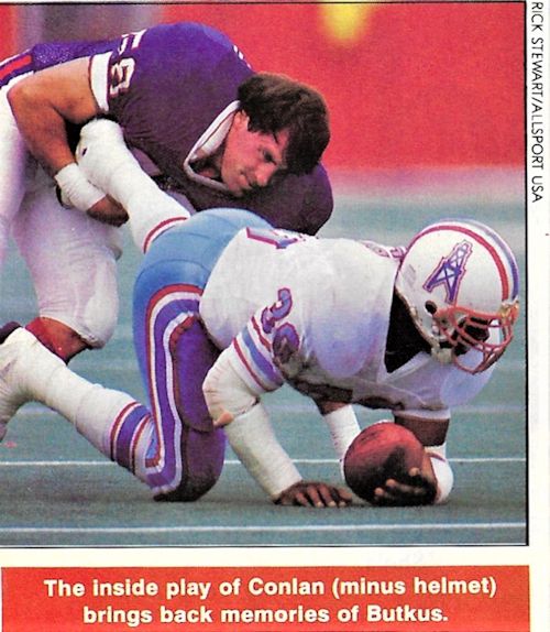 Conlan showed his versatility by starting his first five games at outside linebacker, then, moved inside when Cornelius Bennett was acquired in the three-way trade with the Indianapolis Colts and the Los Angeles Rams.