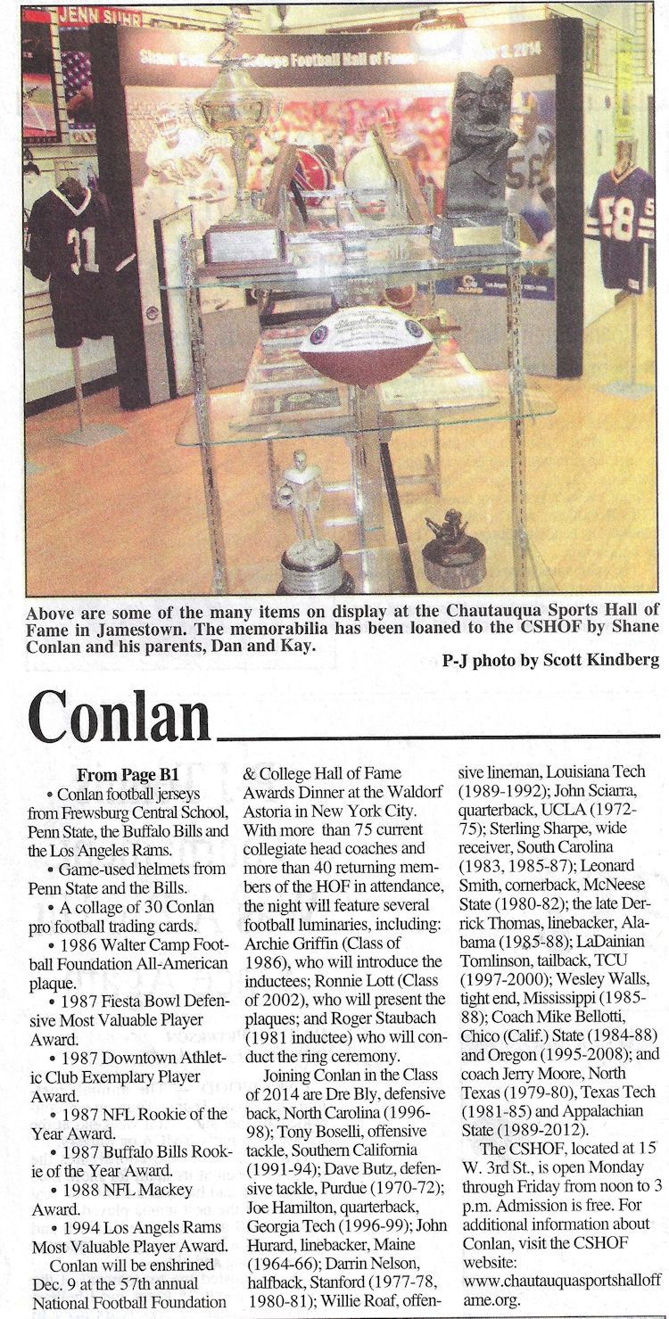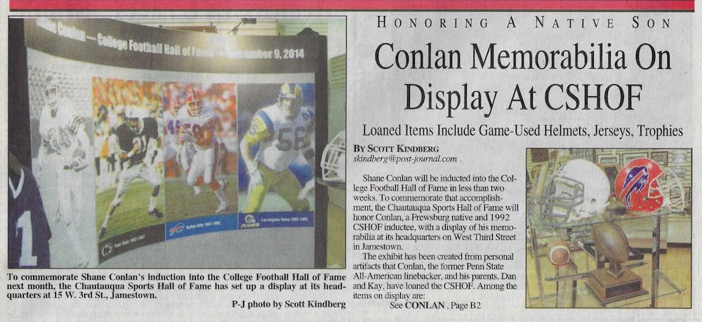 - Kindberg, Scott. "Shane Conlan Learned To Deliver Big Hits In His Back Yard." Post-Journal (Jamestown), January 24, 1992.