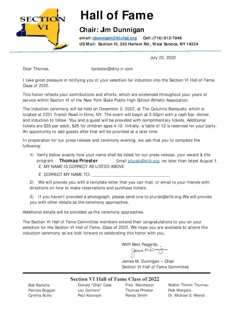 In 2021, Tom was inducted into the North East High School Hall of Fame and in 2022 the NYSPHSAA Section VI Hall of Fame.