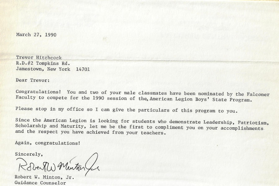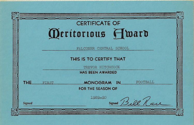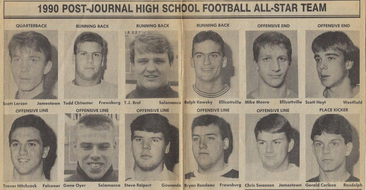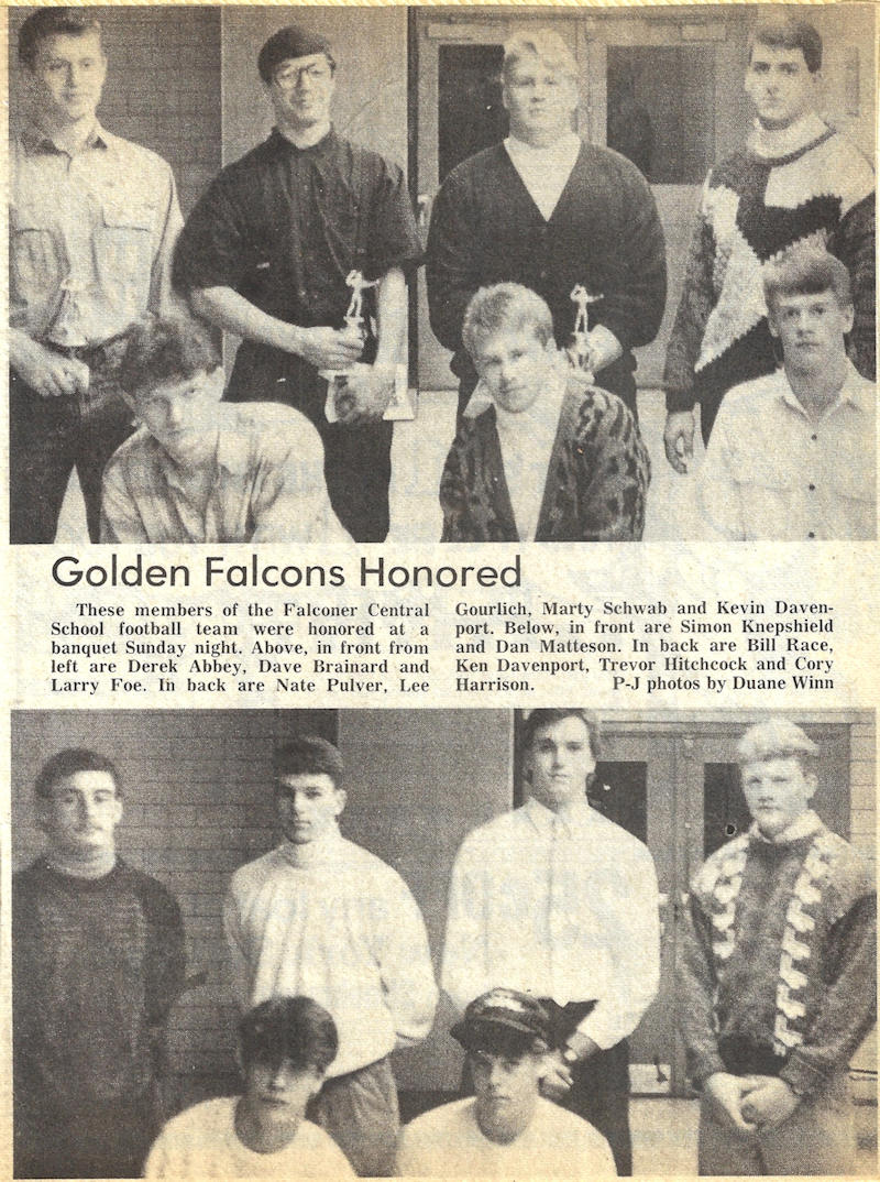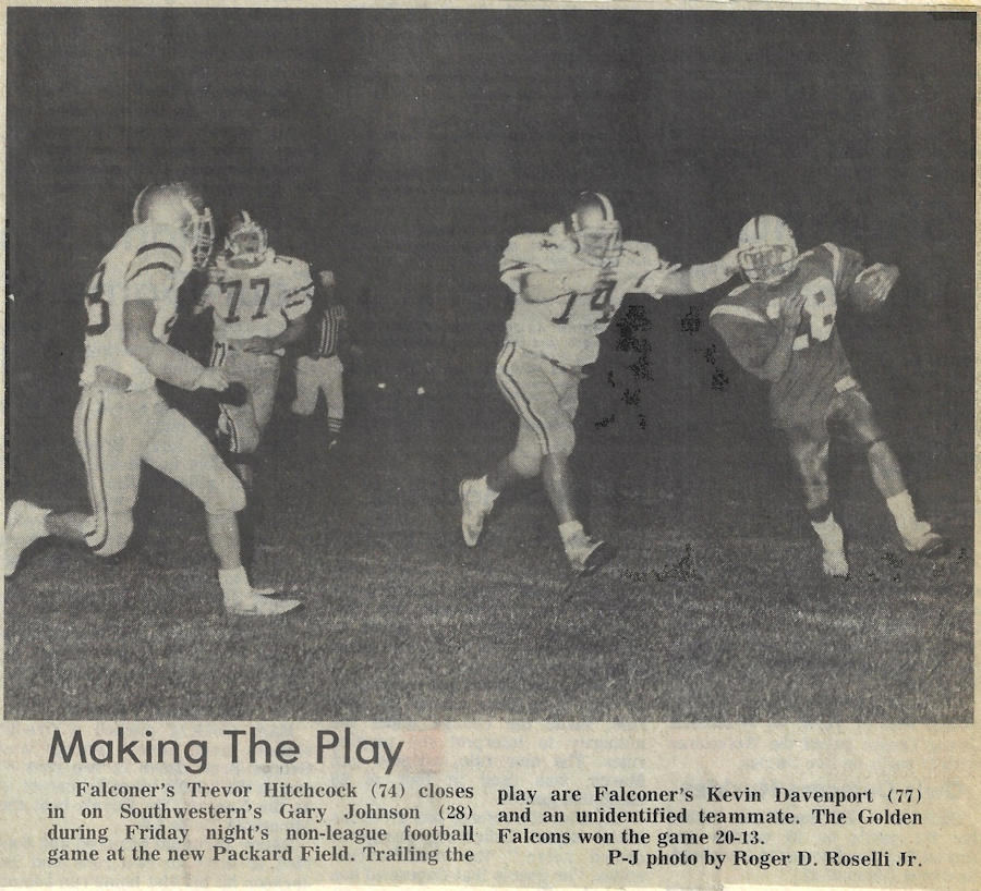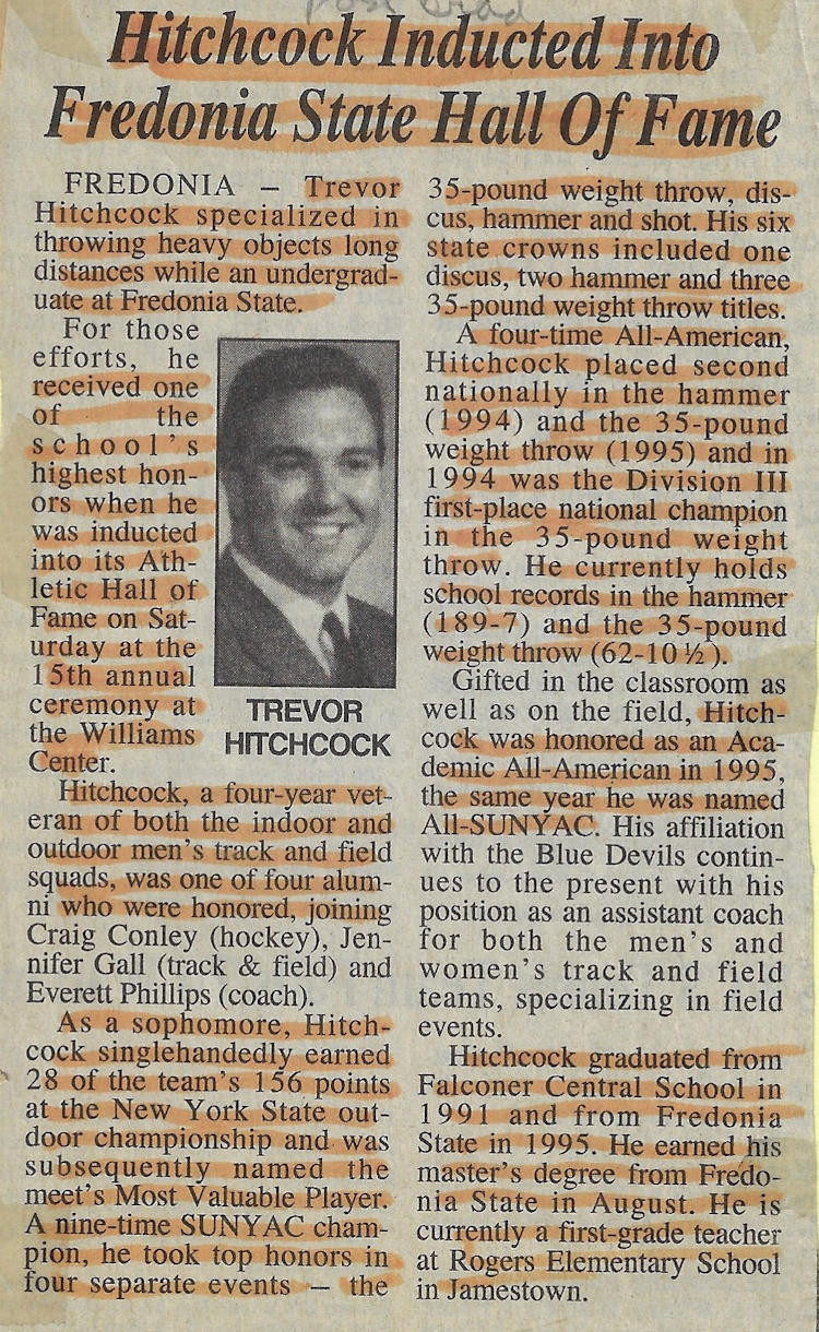A 1991 graduate of Falconer Central School, Hitchcock excelled in three sports for the Golden Falcons: football, basketball and track & field. At 6-foot-4, 225-pounds, Hitchcock used his size, strength and agility to become a Post-Journal First Team All-Star in all three sports. Also an exceptional student and respected leader, he was selected for the 1990 American Legion Boys’ State program.