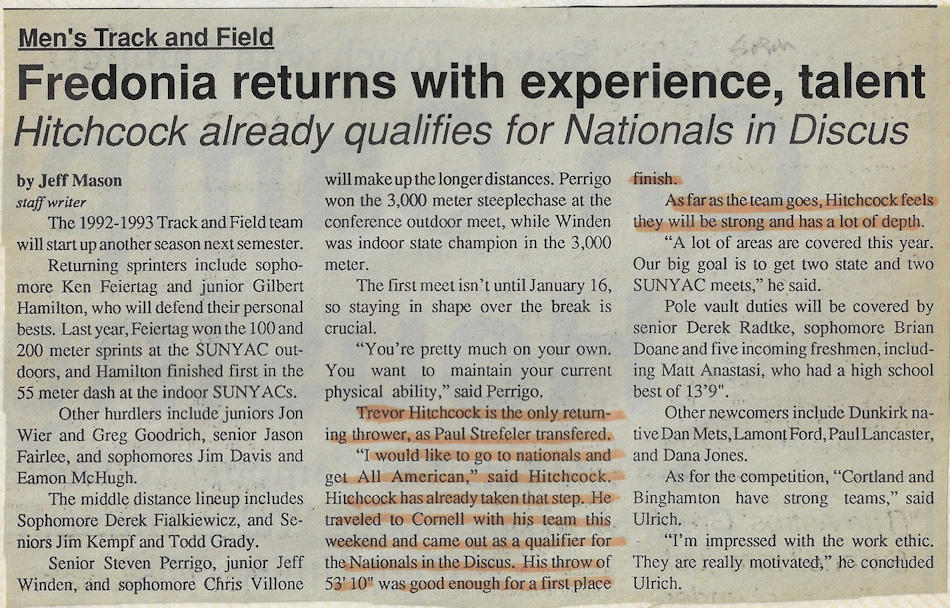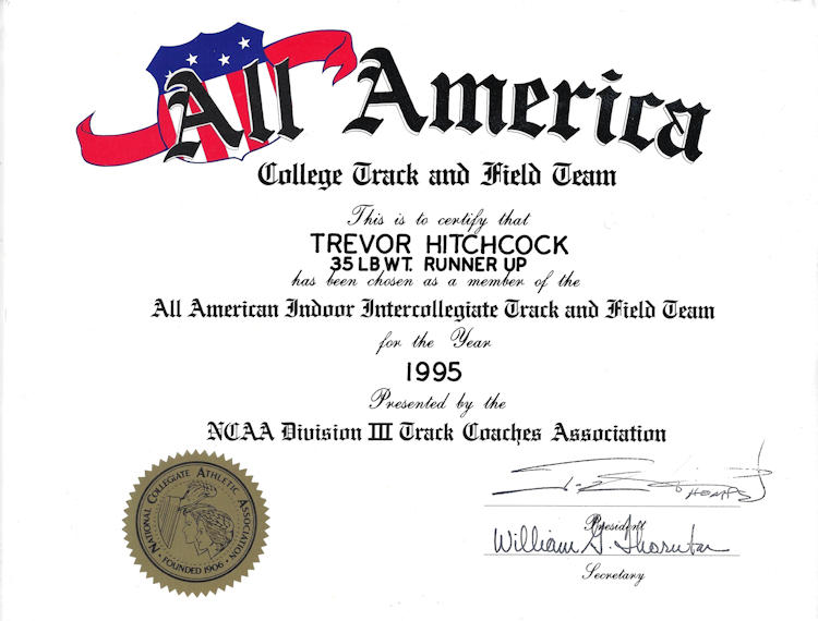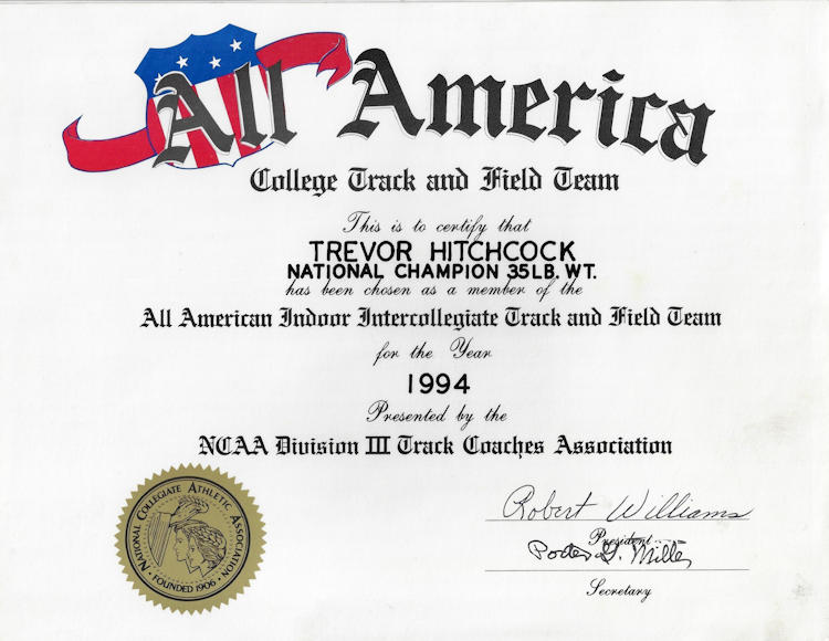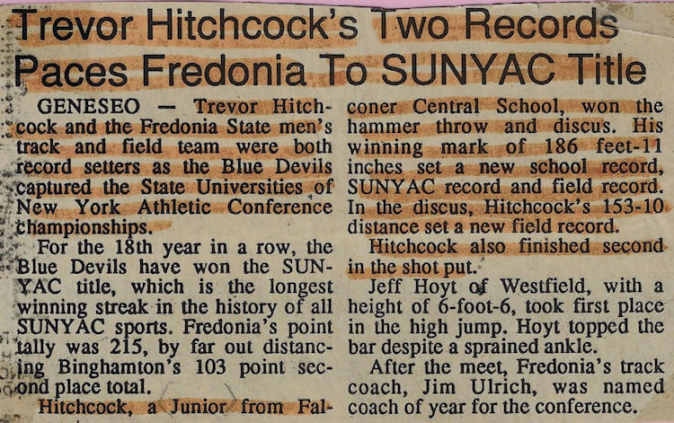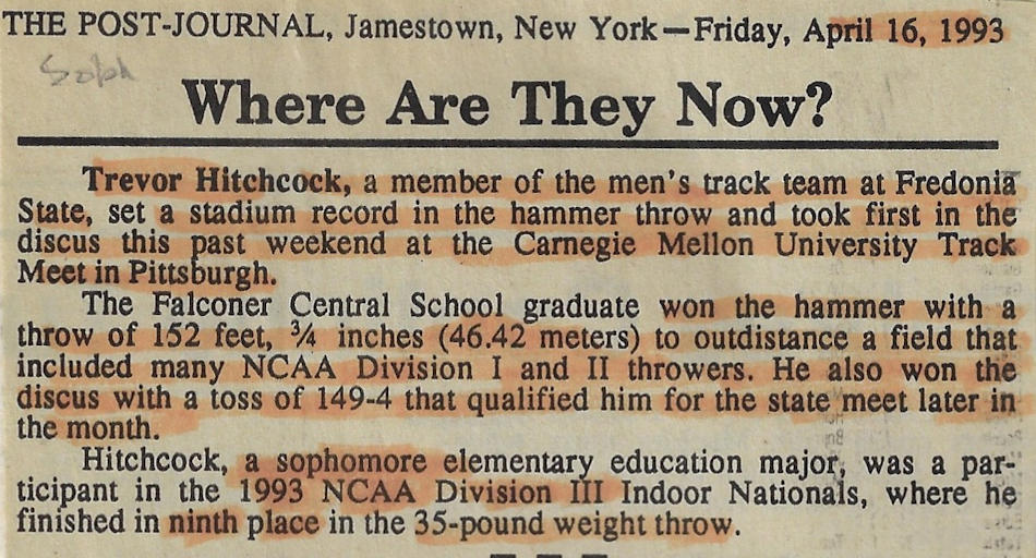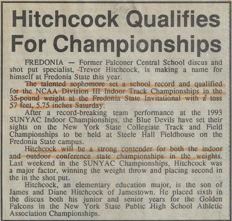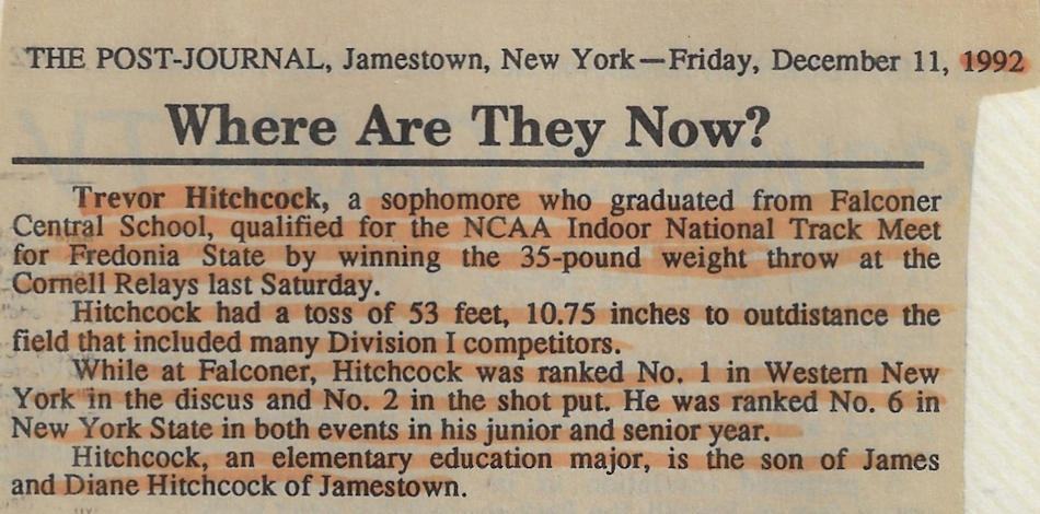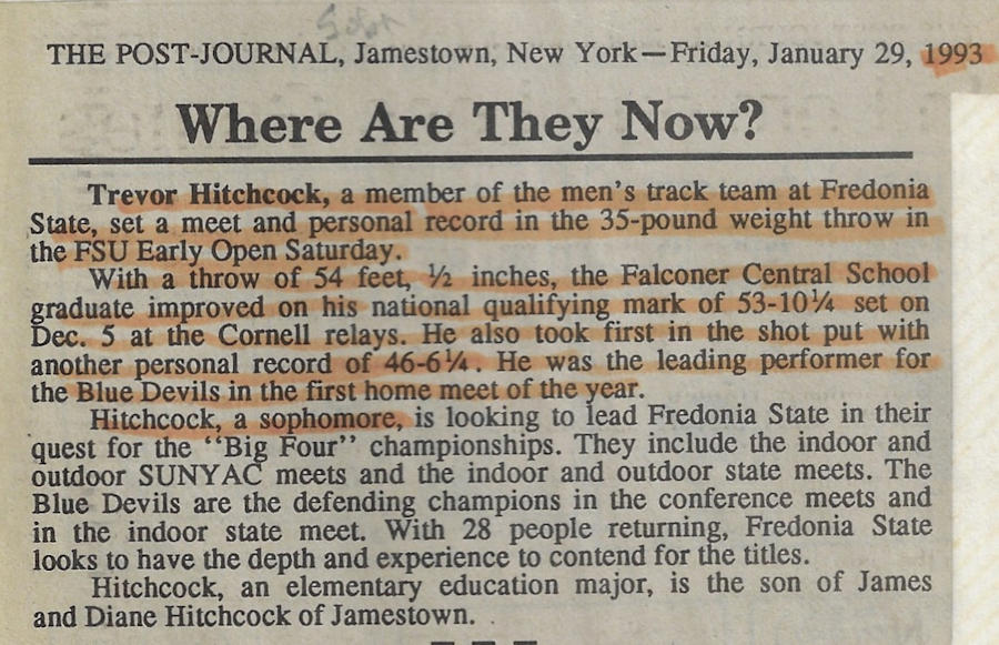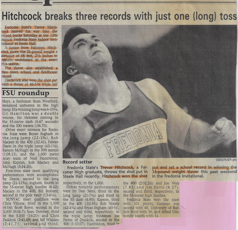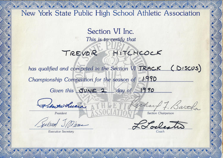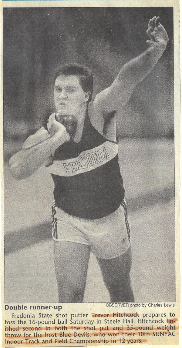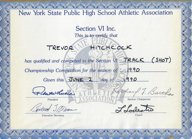 In 1989, 1990 and 1991, Trevor won both the Division II discus and shot put throws at the Chautauqua County Track & Field Championships. He was also the Section 6 discus champ in ‘90 and ‘91 and as a result qualified for the New York State Championships. He finished 6th in the state for the discus in 1990 and improved to 5th place in 1991.