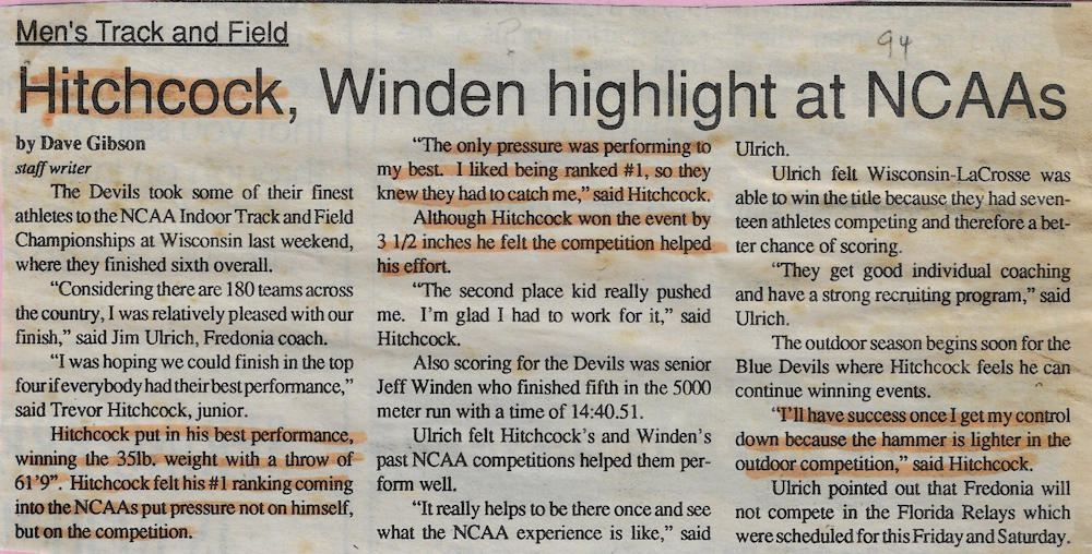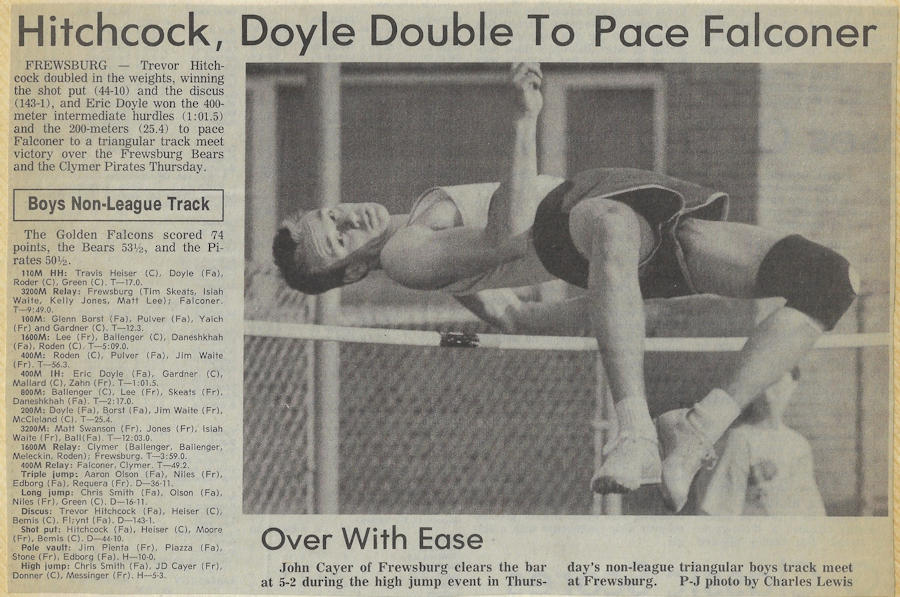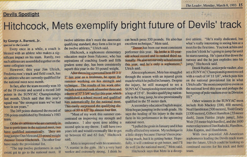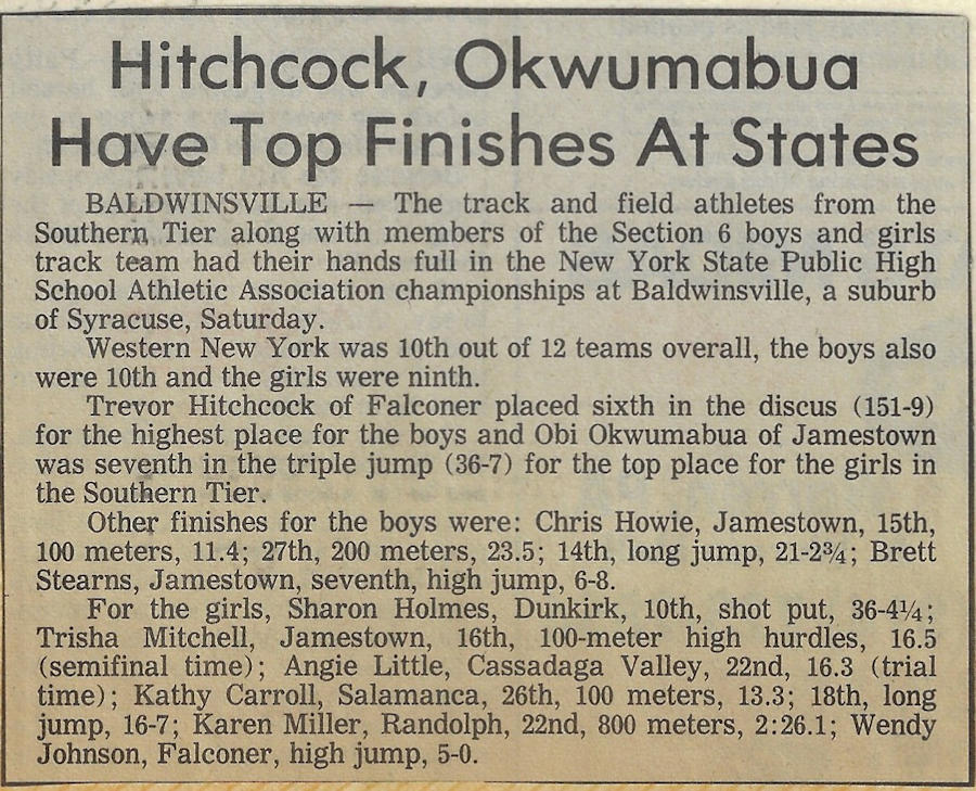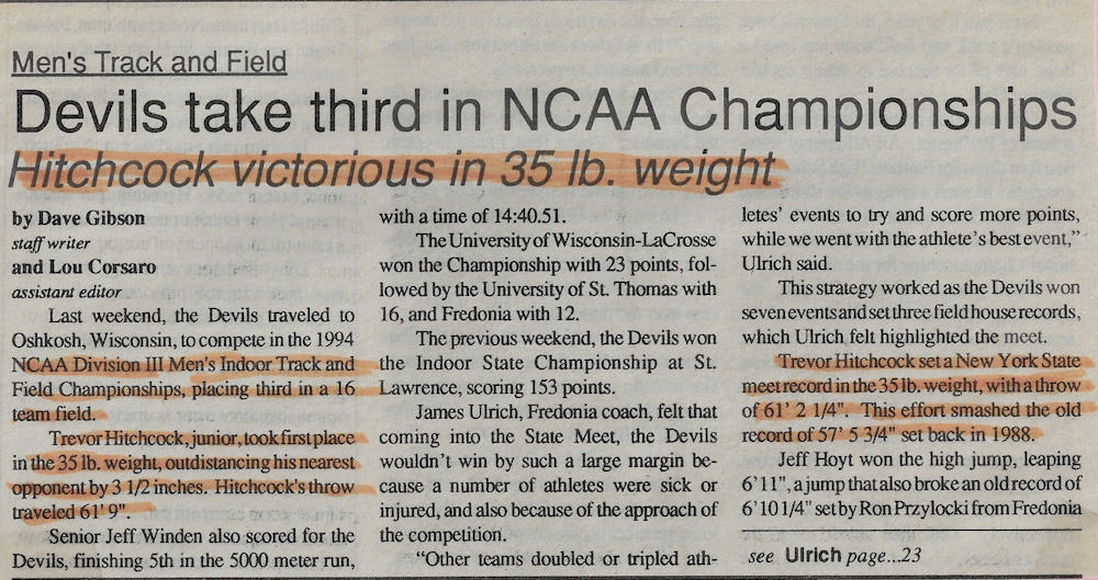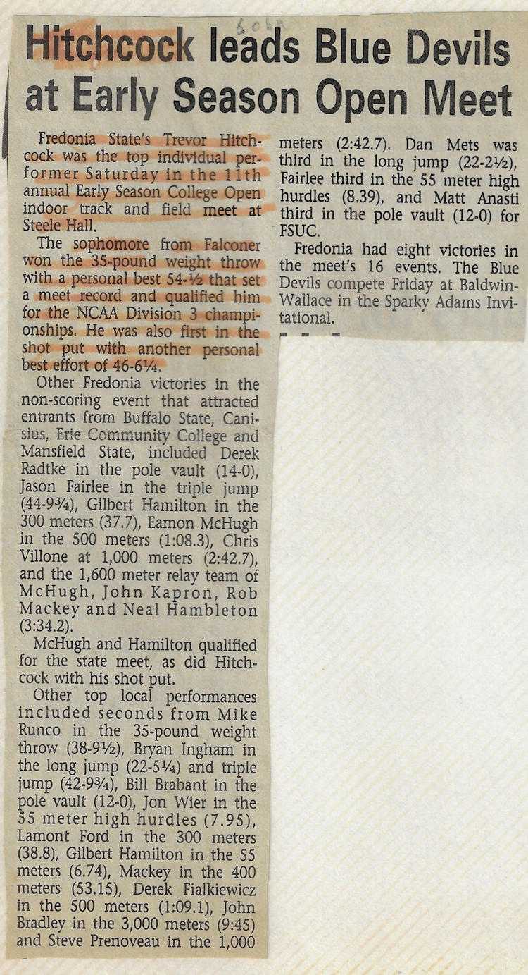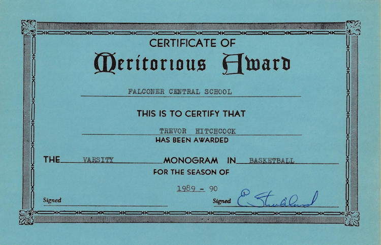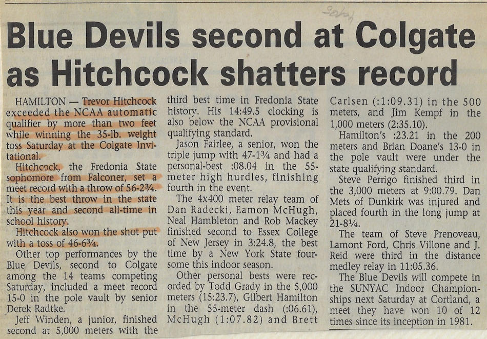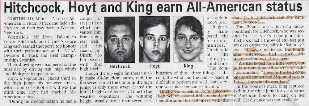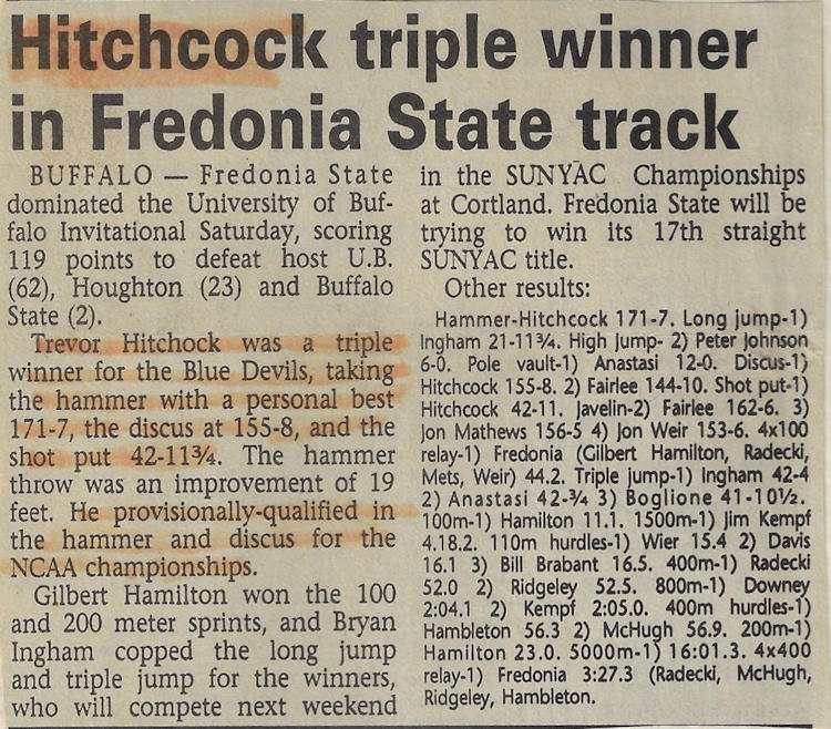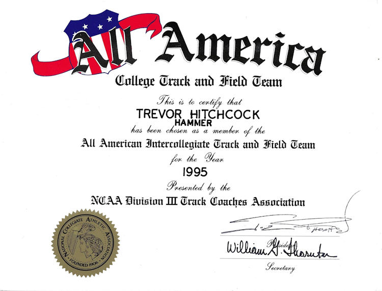 In 1989, 1990 and 1991, Trevor won both the Division II discus and shot put throws at the Chautauqua County Track & Field Championships. He was also the Section 6 discus champ in ‘90 and ‘91 and as a result qualified for the New York State Championships. He finished 6th in the state for the discus in 1990 and improved to 5th place in 1991.