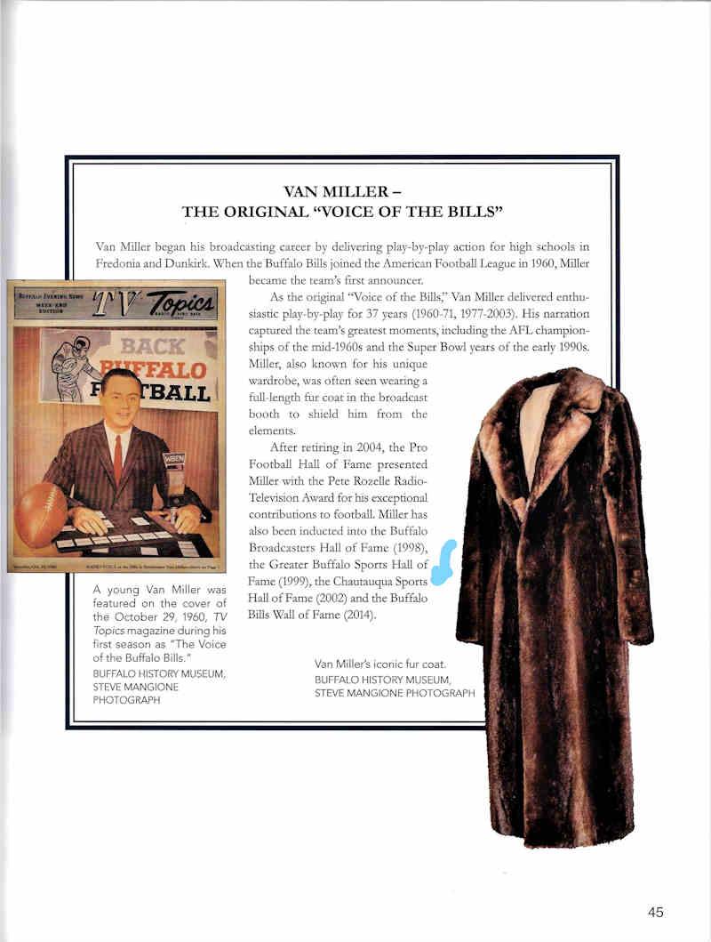 Miller was the play-by-play radio announcer for the Bills. He won that job over Chuck Healy, who like Miller in 1998 was an inductee of the Buffalo Broadcast Pioneers Hall of Fame. Miller started with the Bills in 1960 when they came in as a charter member in the newly-formed American Football League and is the longest running play-by-play man with the same team in the history of the NFL.