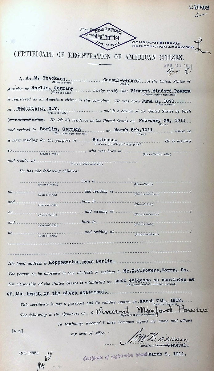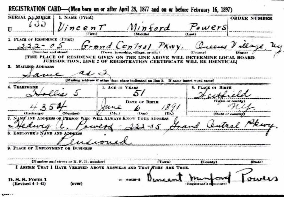 Vincent Powers was born in Westfield, NY on June 6, 1891 and spent the early years of his life in the village along the Lake Erie shore as well as the nearby community of Panama.