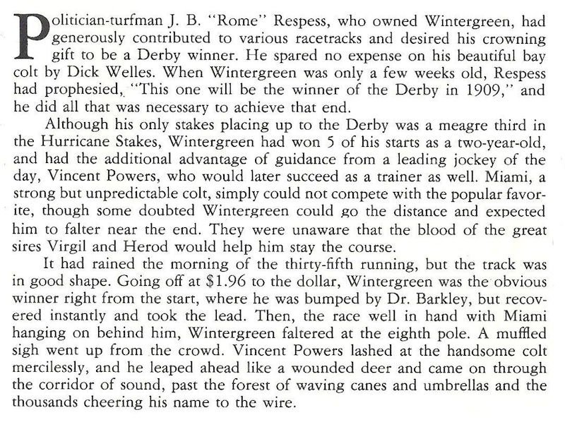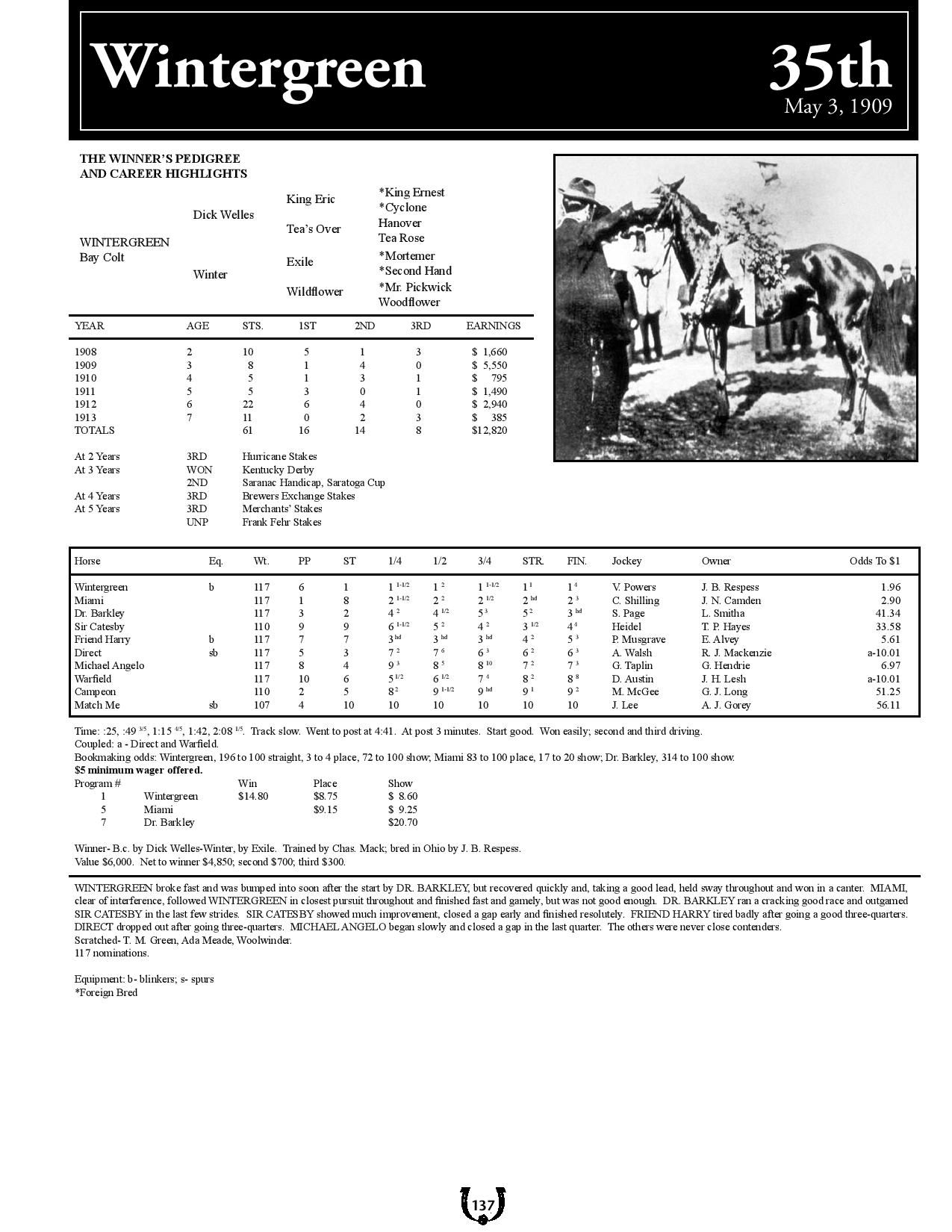 Leaving from the sixth post postion, Wintergreen was bumped at the start of the Derby race but recovered quickly. He took a good early lead and held sway throughout. He won in a canter by four lengths with a time of 2:08.20. The winner's purse in 1909 was $4,850.