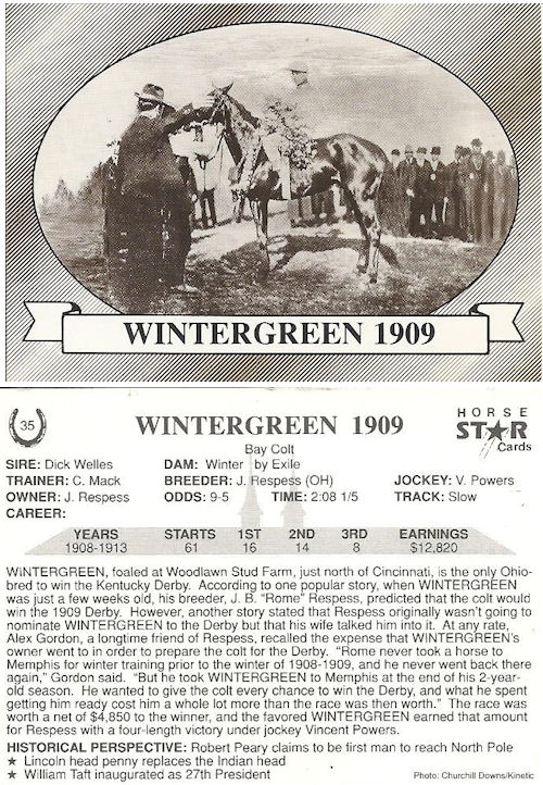 Bred in Ohio by Jerome Bristow Respess, the multi-millionaire owner of a brewing company, and trained by Charles Mack, Wintergreen had won 5 races in 10 starts at age 2, and finished third in one stakes race.