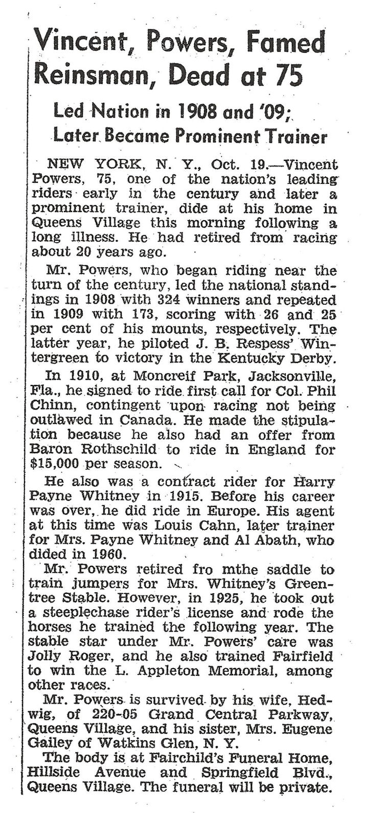 - Newman, Neil. "Vincent Powers." Turf and Sport Digest, April 1938.